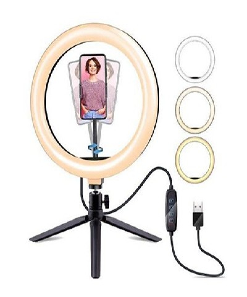【10 inches ring】This product has 3 color lighting modes: Warm Yellow, Cool White, and Warm White. Each mode has 10 brightness levels to choose from, which helps you whenever you need extra light to remove the shadow for make-up, take photos and selfies, make videos, live streaming and more!