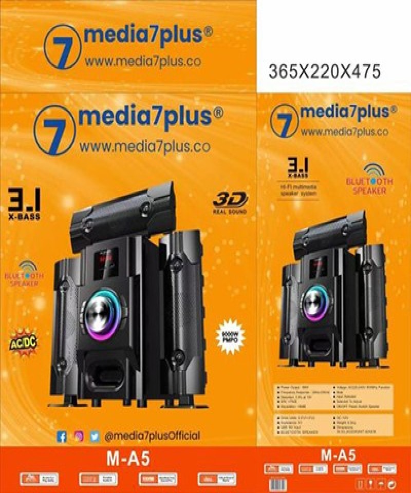 Bring your audio experience to life with the Media7plus M-A5 3.1 Bluetooth Speaker System. Designed for powerful and immersive sound, this speaker system is perfect for home entertainment, delivering crisp highs, rich mids, and deep bass. With 9000W PMPO (Peak Music Power Output), it’s built to transform any space into a sound paradise.