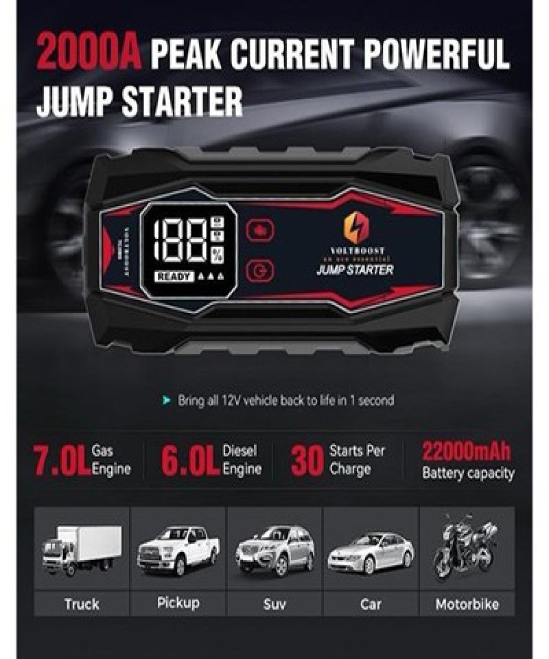 VOLTBOOST TC3000 PORTABLE CAR BATTERY JUMP STARTER, 12V BATTERY BOOSTER PACK, 7.0L GAS/6.0L DIESEL ENGINE, 22000 MAh BATTERY CAPACITY, 2000A PEAK CURRENT